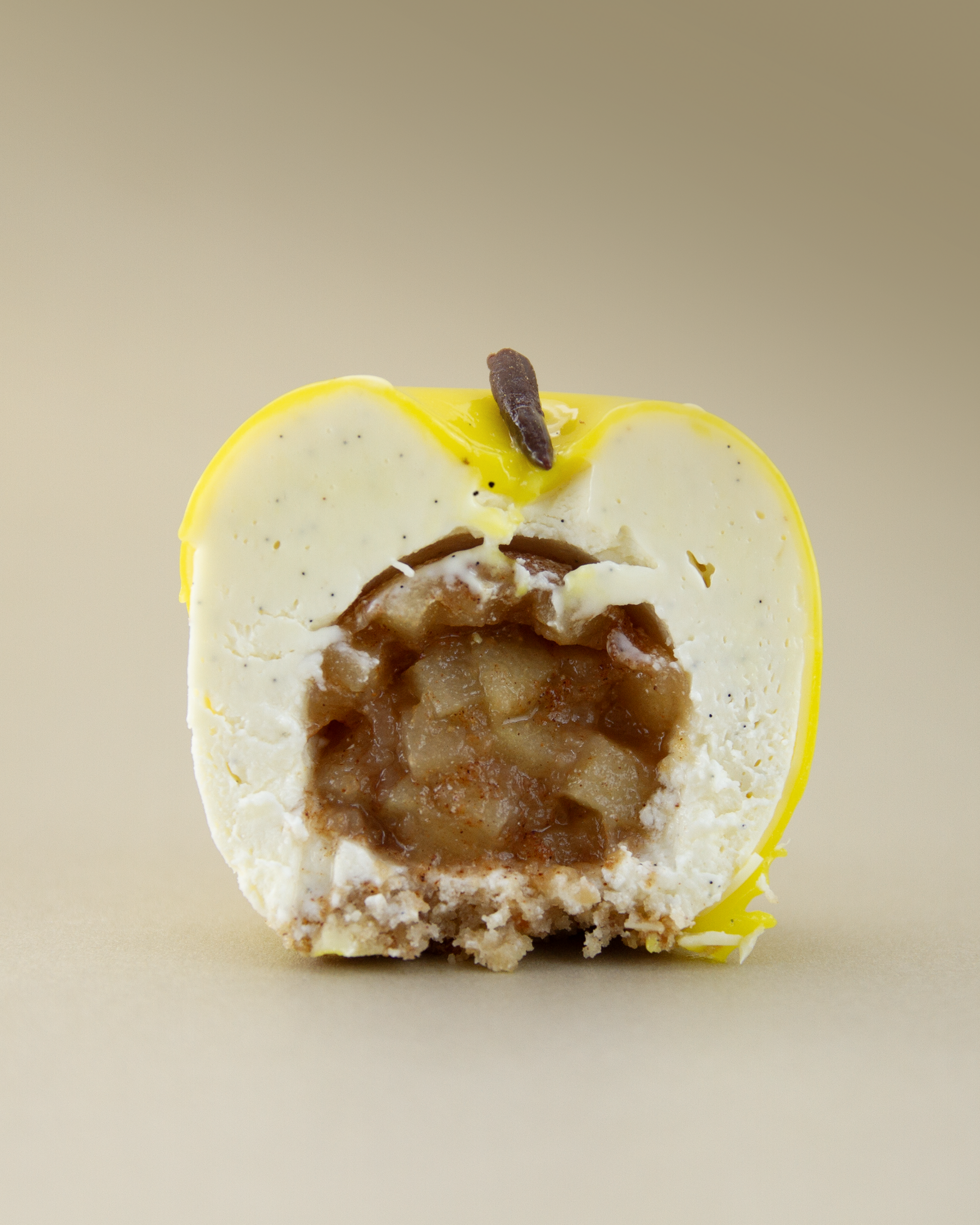 Elegantna slastica koja spaja klasične okuse s modernom izvedbom. Ispod hrskave „kore” od bijele čokolade krije se sočna jezgra od svježe jabuke, aromatičnog đumbira i cimeta. Krema od vanilije, cimeta i bijele čokolade donosi profinjenu slatkoću i upotpunjuje sklad okusa. Završni dodir daje glazura s nježnom notom vanilije.