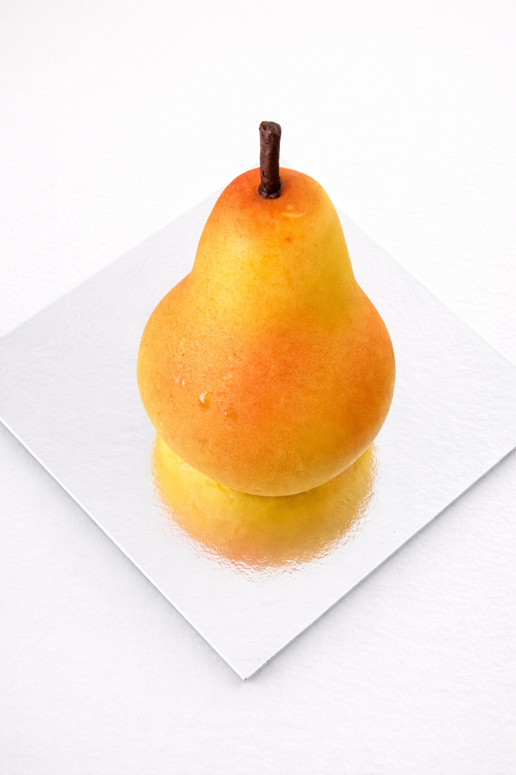 Ispod hrskave ljuske krije se nježna jezgra od pirea kruške kuhane u vinu, obogaćena notama anisa i vanilije. Baršunasti ganache monté od mliječne čokolade i meda zaokružuje okus, donoseći skladnu ravnotežu voćne svježine i blage slatkoće.