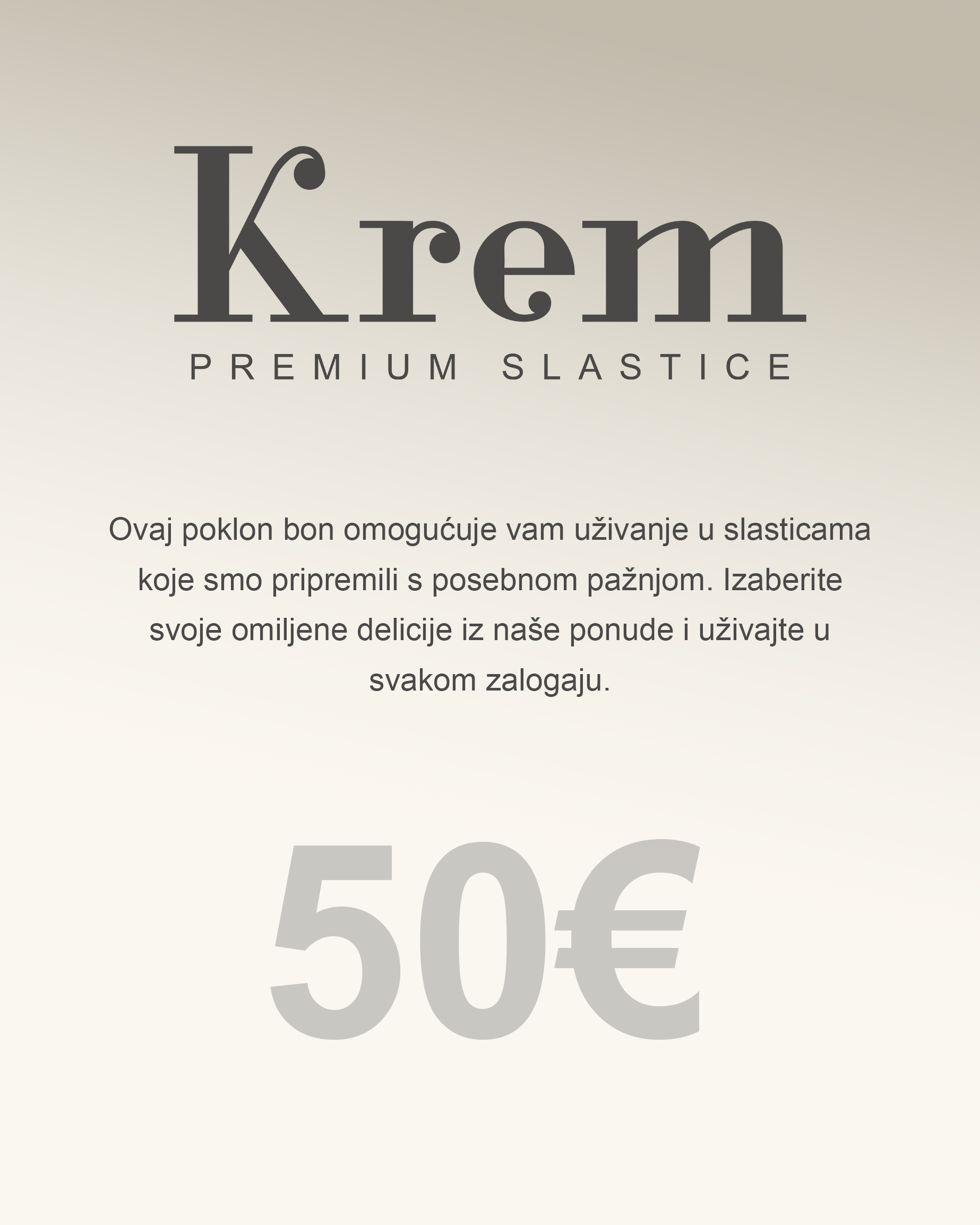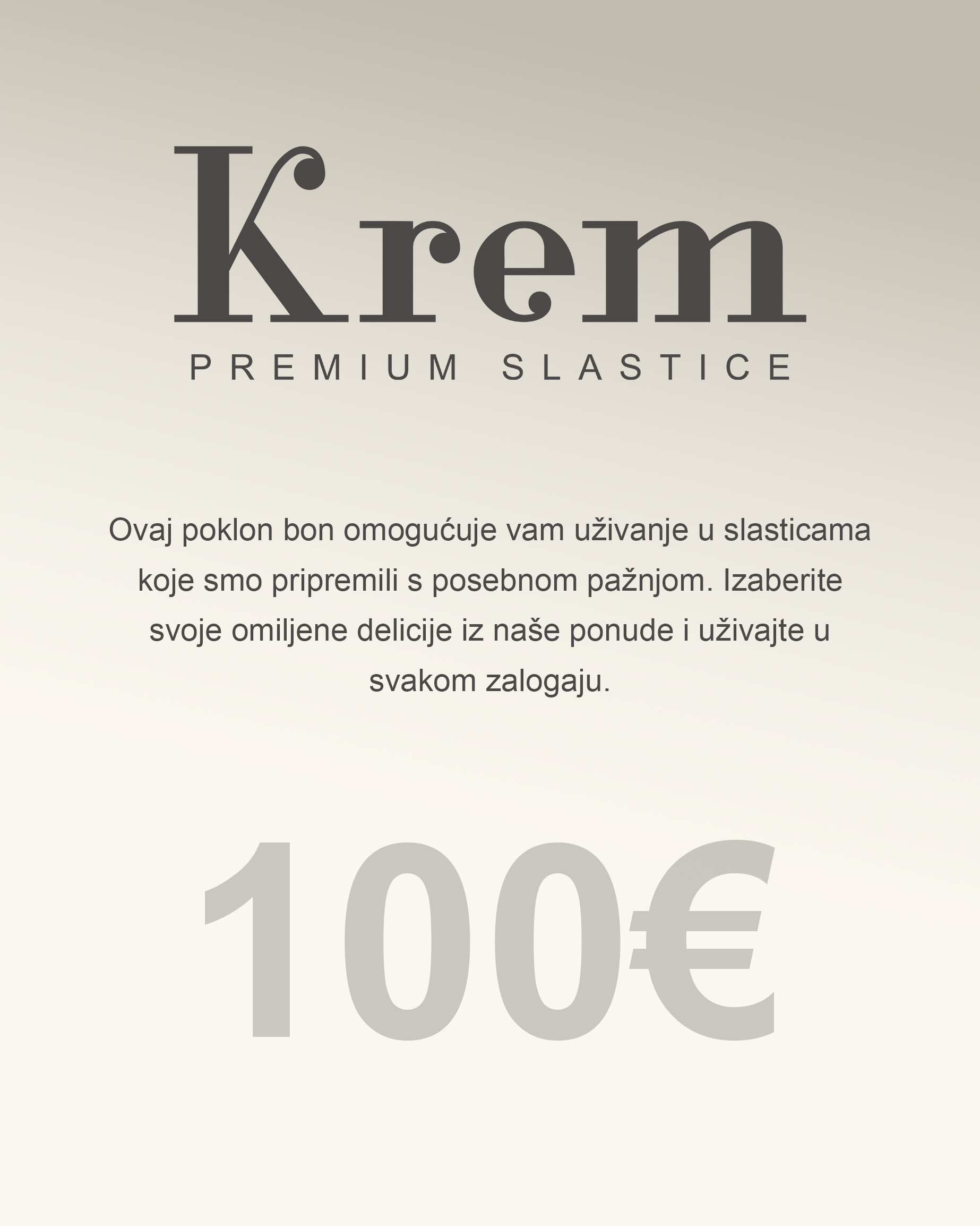 Darujte nezaboravno iskustvo uživanja u vrhunskim slasticama iz Krema! Naš poklon bon omogućuje odabir omiljenih delicija iz naše ponude – od čokoladnih pralina do modernih kolača i torti. Idealno za sve prigode: rođendane, godišnjice ili jednostavno kao znak pažnje.